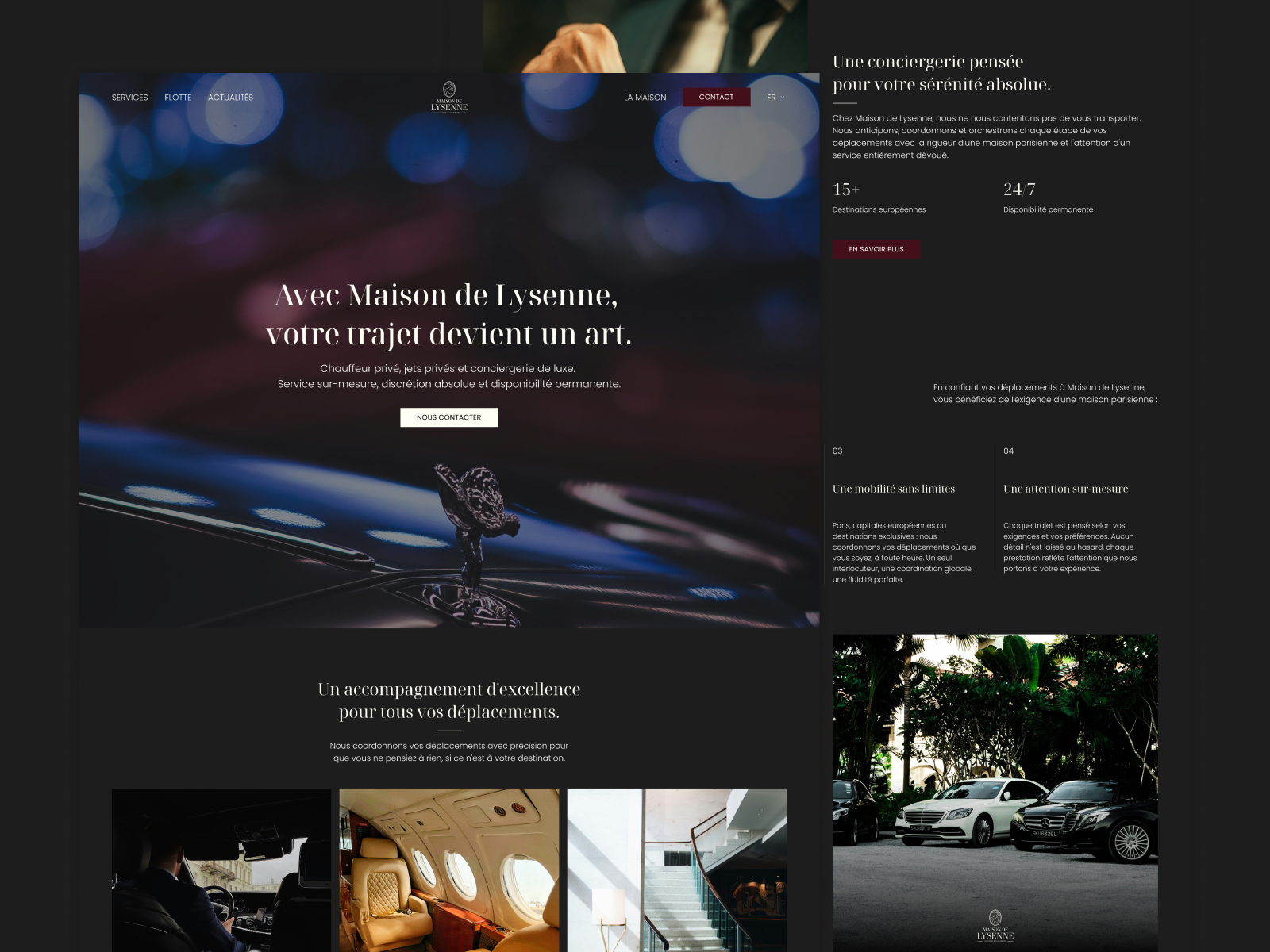 Luxury chauffeur service brand identity. Dark theme UI with gold accents, subtle animations, premium typography, and seamless bilingual experience crafted for Parisian elegance.